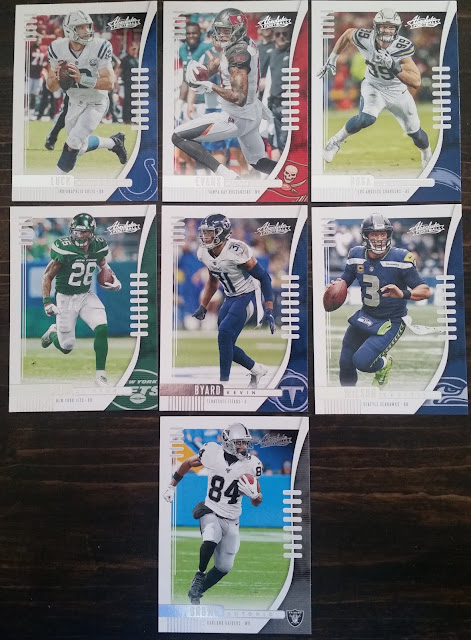 Score is always a fun, cheap break with a lot of inserts, apparently. I like this year's Score, but the damaged pack leaves a bit of a bitter taste in my mouth--especially because I got some pretty good cards that were among the damaged. Absolute absolutely came through this year, in my opinion. For five jumbo packs for about $20, I certainly enjoyed the break.